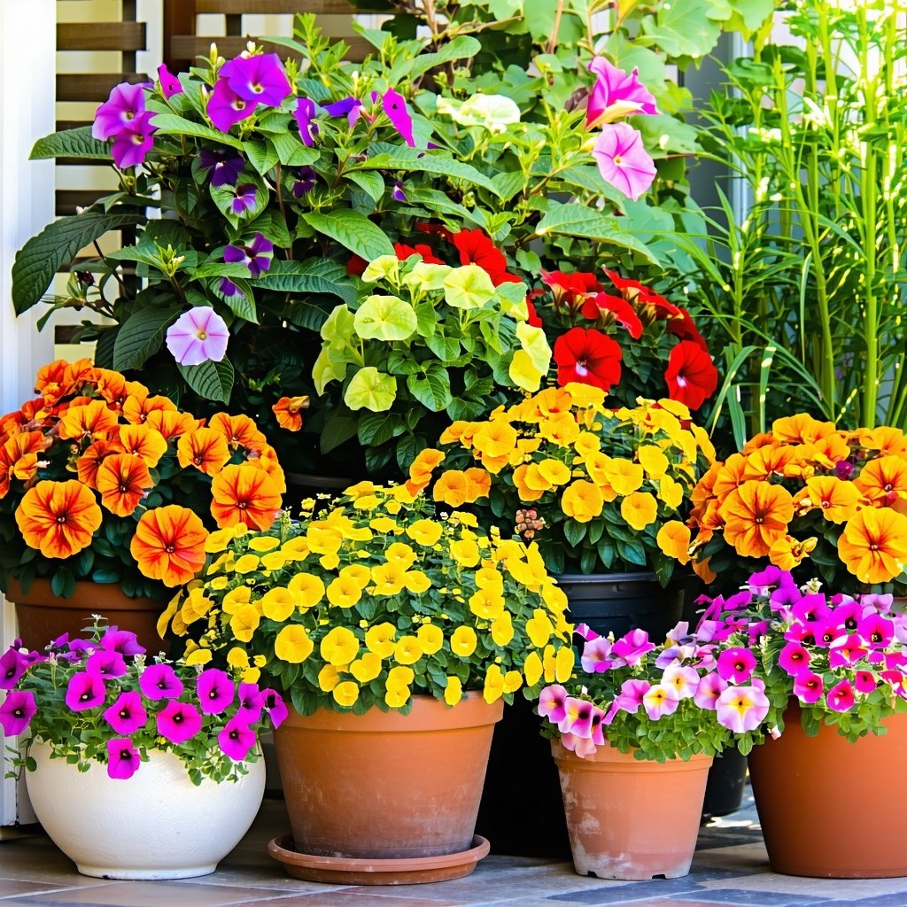 Petunias: Renowned for their vibrant hues and prolific blooming, petunias flourish in full sun and well-drained soil. Regular deadheading encourages continuous flowering throughout the season.