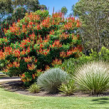 Grevilleas offer diverse forms and colors, with many species flowering year-round. Their nectar-rich blooms are a favorite among honeyeaters and native bees.