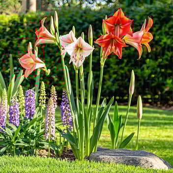 Contrasting leaf shapes—from strappy blades to frilly or broad leaves—make bulbs pop. Mix foliage tones too: silvery, glossy green, variegated, deep maroon. Flowers and foliage form harmonies: a bold red amaryllis surrounded by silver-leafed groundcover becomes a statement.