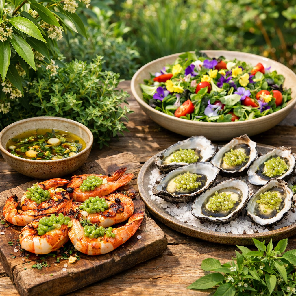 Pairing becomes intuitive. Native citrus with seafood. Earthy bush tomato with roasted meats. Sweet-tart fruits folded into desserts. The garden becomes both pantry and inspiration.