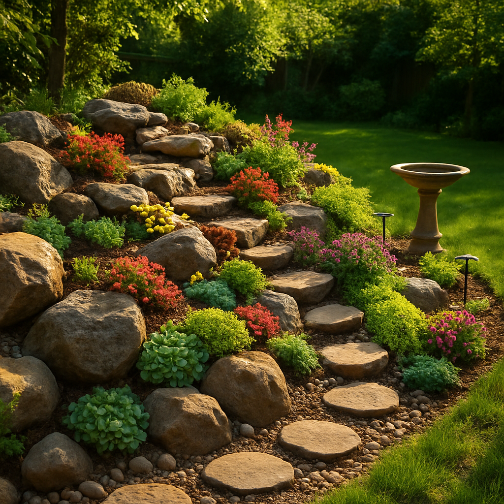 Create stepping-stone paths through or around the rockery. Scatter smooth pebbles in void spaces. Incorporate a birdbath, bee hotel, or frog-friendly pool to boost biodiversity.